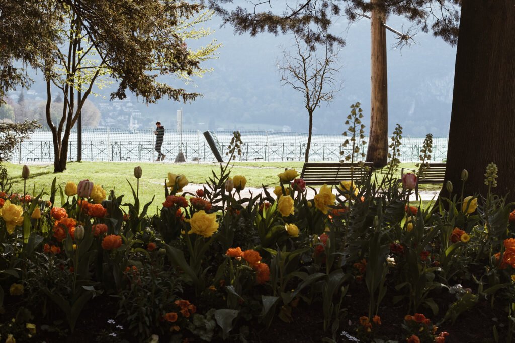 Além desse apaixonante centro histórico, Annecy tem vistas lindas para as montanhas e para o seu lago. Ficar andando ao redor daquele lago de águas cristalinas, enquanto observa as pessoas fazendo todo tipo de atividades por lá, é uma das coisas mais deliciosas e relaxantes que fizemos nos últimos tempos. Ao redor do lago você pode passar pelo Jardins de l’Europe e a Pont des Amours (dizem que você precisa beijar a pessoa amada nessa ponte para ficarem juntos pra sempre, hehehe).