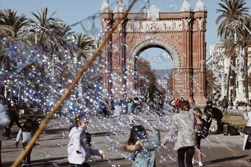 Um dos lugares que mais amamos conhecer foi a região onde fica o Arco do Triunfo. O monumento em si é belíssimo, construído para ser porta de entrada de uma exposição muito importante que aconteceria na época de 1888. Além disso, ele está inserido em um contexto muuuito belo, com uma ampla avenida de 50 metros de largura, com árvores por toda lateral, esculturas, candeeiros, bancos agradáveis para sentar… sem contar os artistas de performances e músicos que estão sempre dando vida a esses locais. Foi um dos dias mais memoráveis da viagem, nunca mais esqueceremos, pois esse local tem uma energia muito contagiante, feliz e lúdica.