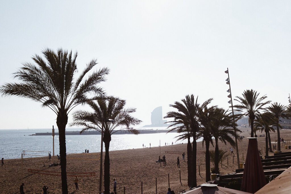 Por ali, passeamos bastante pela orla, pois mesmo no inverno Barcelona não faz tanto frio e em dias ensolarados, você consegue encontrar os 16°C/17°C graus, bem agradáveis para uma caminhada na praia. Tinha muitas pessoas jogando vôlei, fazendo outros esportes ou exercícios (e alguns mais aventureiros estavam se banhando no mar sim hehe).