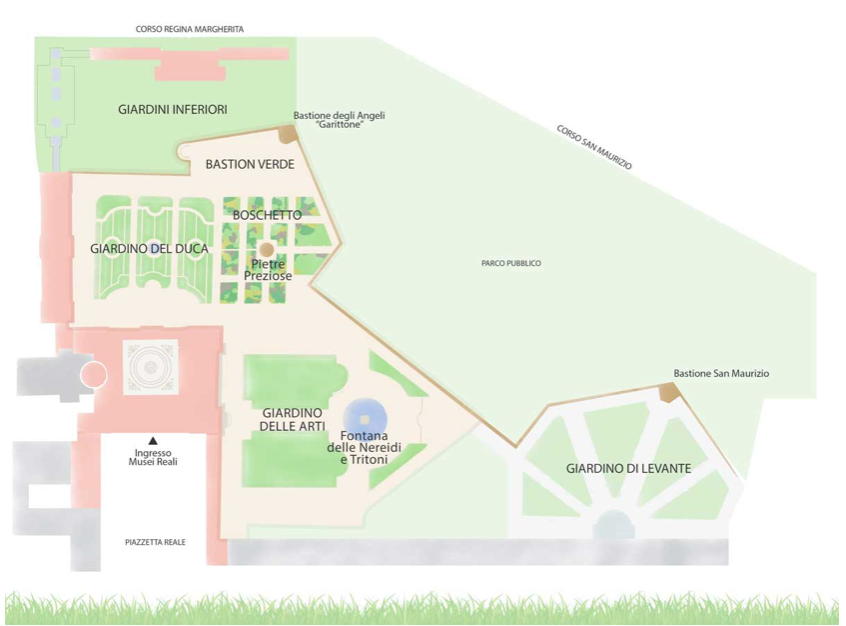 Toda essa área é dividida em: Giardino del Duca, Boschetto, Giardino delle Arti, Le Mura, Il Garittone e I Giardini Inferiori.