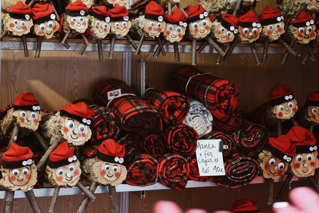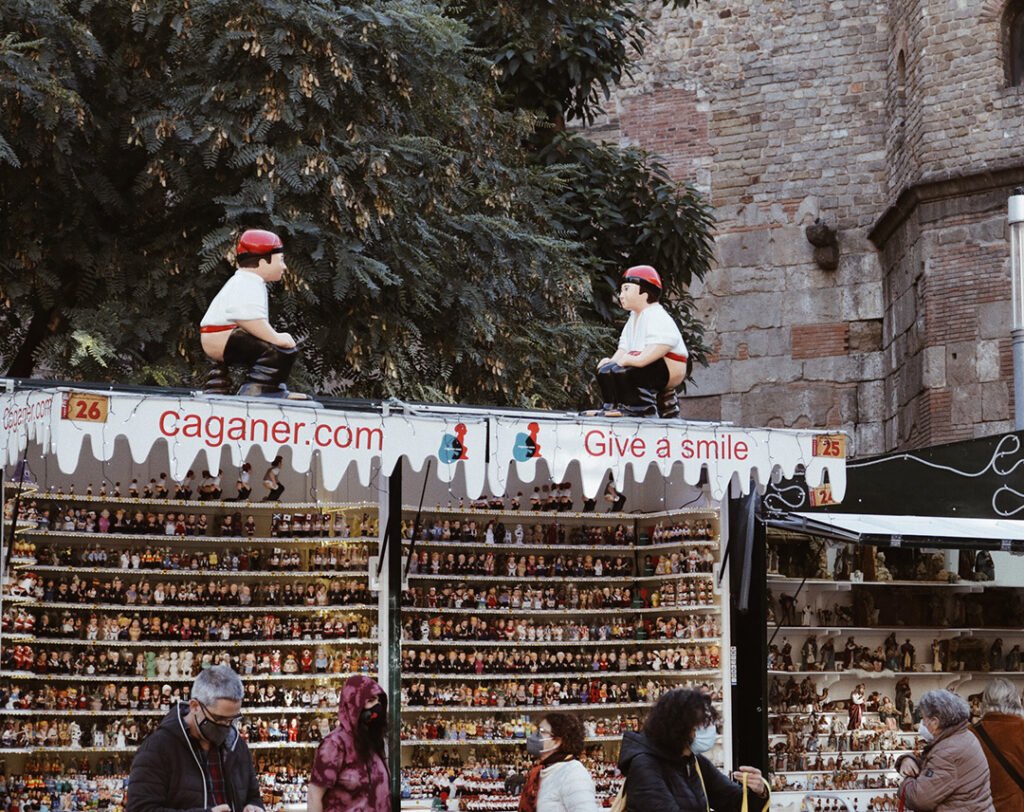 Outra curiosidade muito diferente das tradições do natal catalão são esses bonequinhos chamados Caganers. Nas feiras você verá muitas barraquinhas com esses homenzinhos a venda. Eles estão de camisa branca e chapéu vermelho, agachados fazendo coco 💩… pelo que vimos, essa roupa que eles usam é a representação das roupas que o homem catalão do campo usava antigamente. Pesquisando, vimos que esse ato de defecar, nos tempos antigos e rurais, remetia a bonança, prosperidade e abundância. Por isso, dar um bonequinho Caganer para alguém representa o seu desejo de prosperidade para aquela pessoa (ou também ter o seu bonequinho em casa).