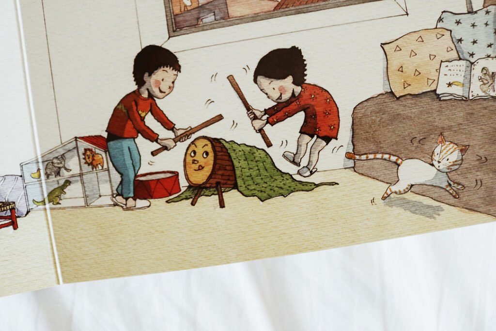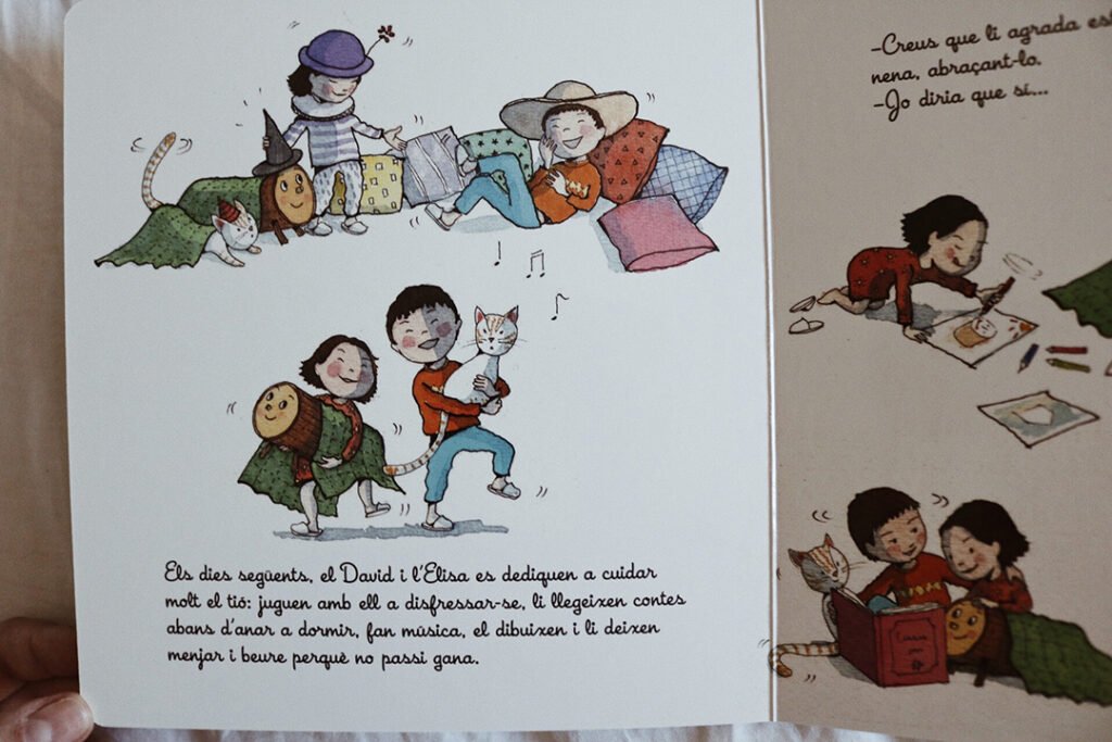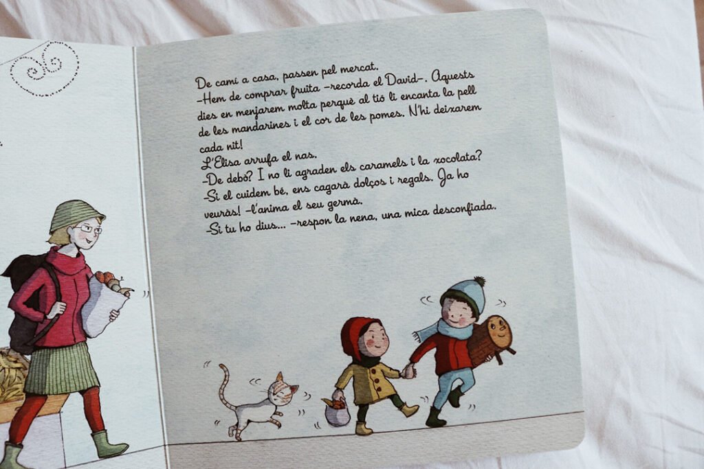 Nós compramos, além do tronquinho Tió, um livro infantil que conta a história de duas crianças na época do natal, saindo para a floresta pra buscar o tronquinho, fazer seu Tió e cuidar dele até o dia de natal para que, nessa celebração, ele “cague” todos os docinhos que comeu.